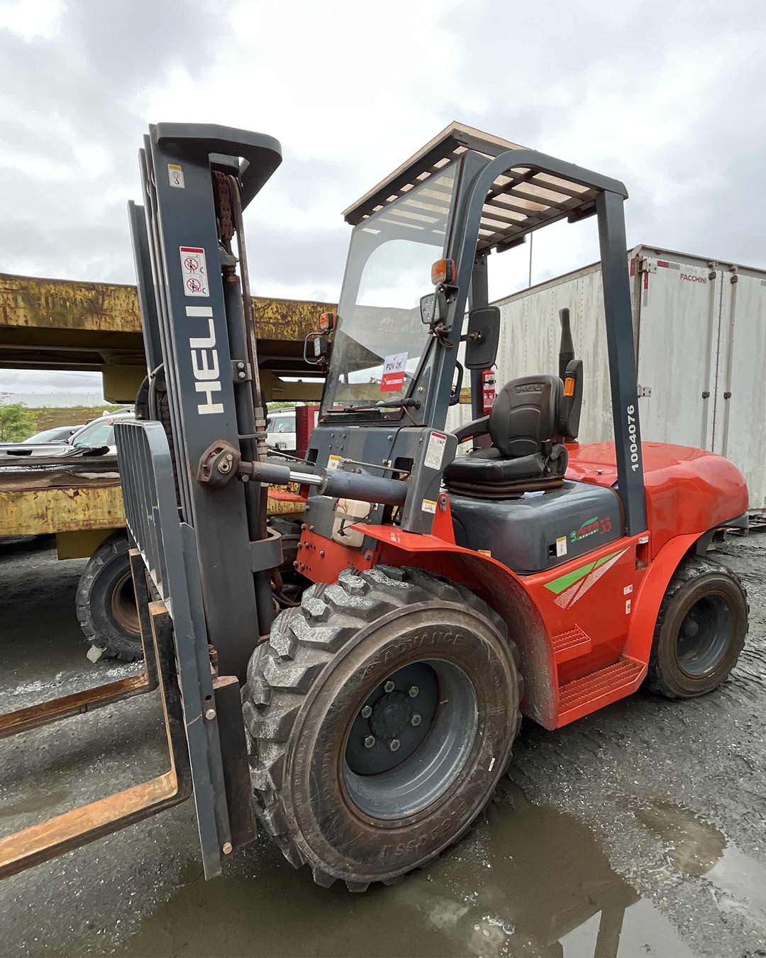 OBS: Empilhadeira HELI diesel, torre triplex, com deslocador, com par de garfos, possui também 1 lança guindaste, marca SAUR.